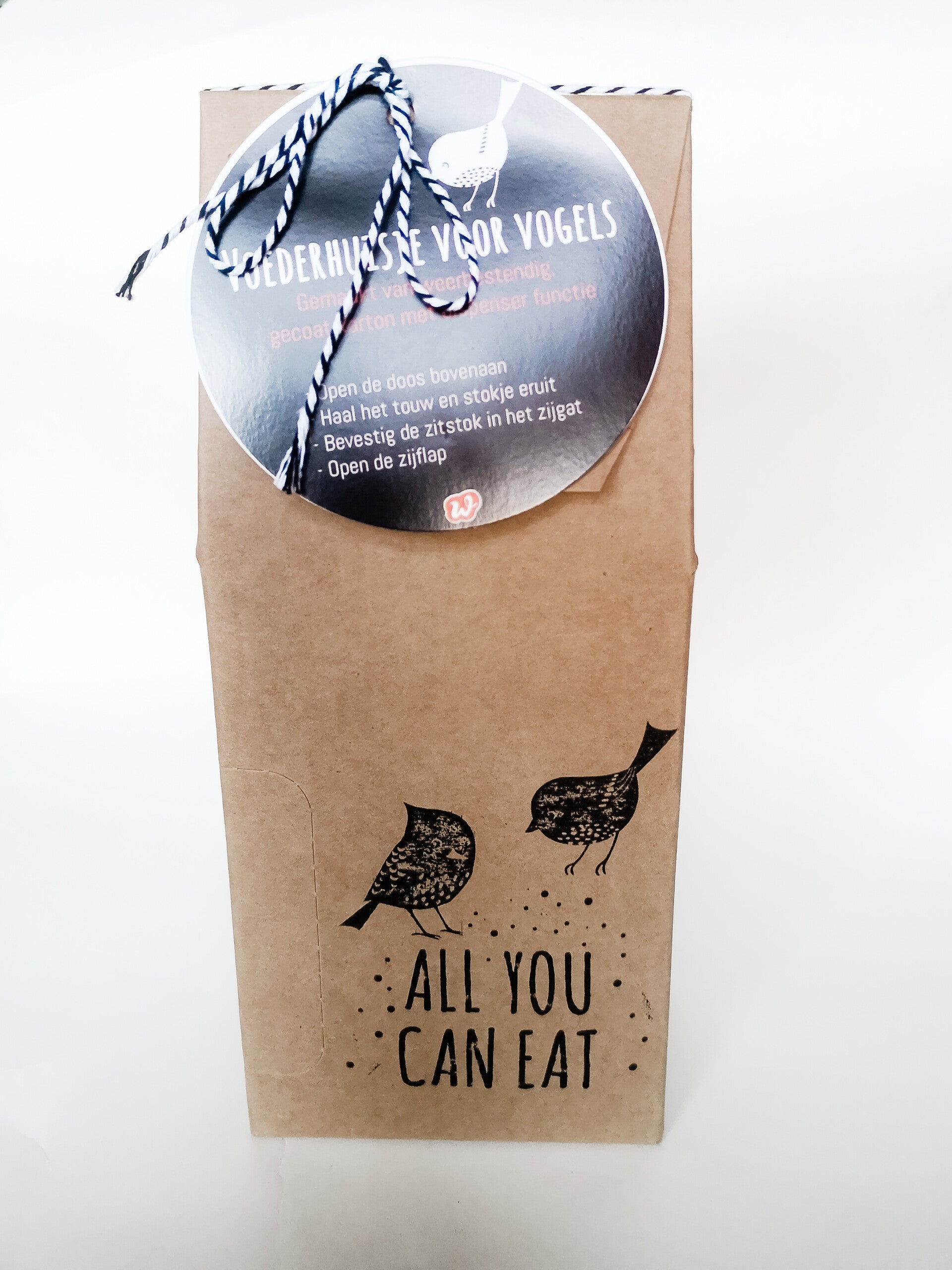 Dit vogelvoederhuisje zet je gemakkelijk in elkaar en is weerbestendig door een coating op het karton.