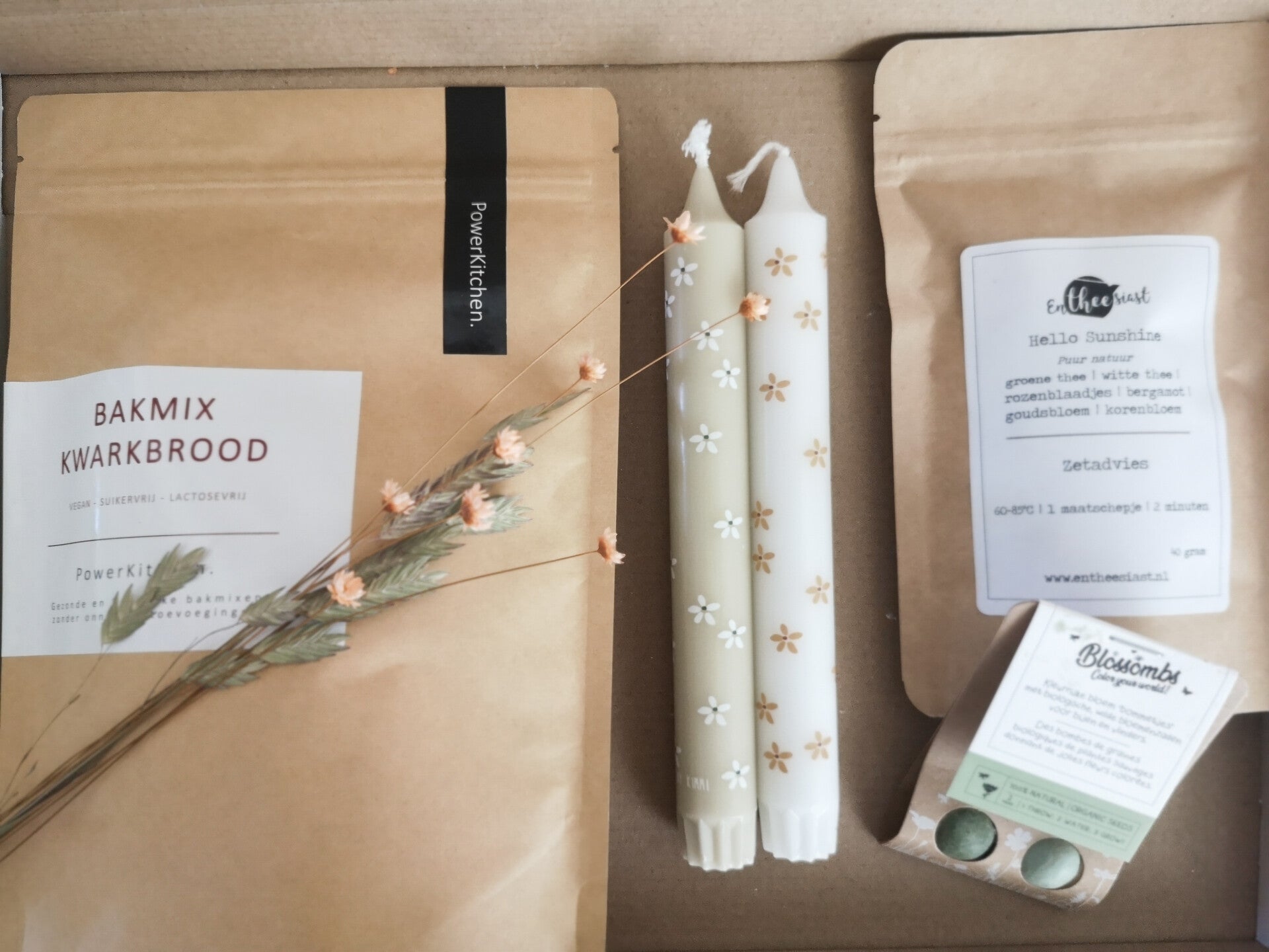 Bakmix Kwarkbrood, een heerlijk frisse voorjaars thee, Blossombs en 2 vrolijke kaarsen.