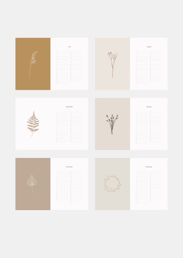 Prachtige kalender met 12 verschillende botanische tekeningen in mooie, rustige natureltinten.