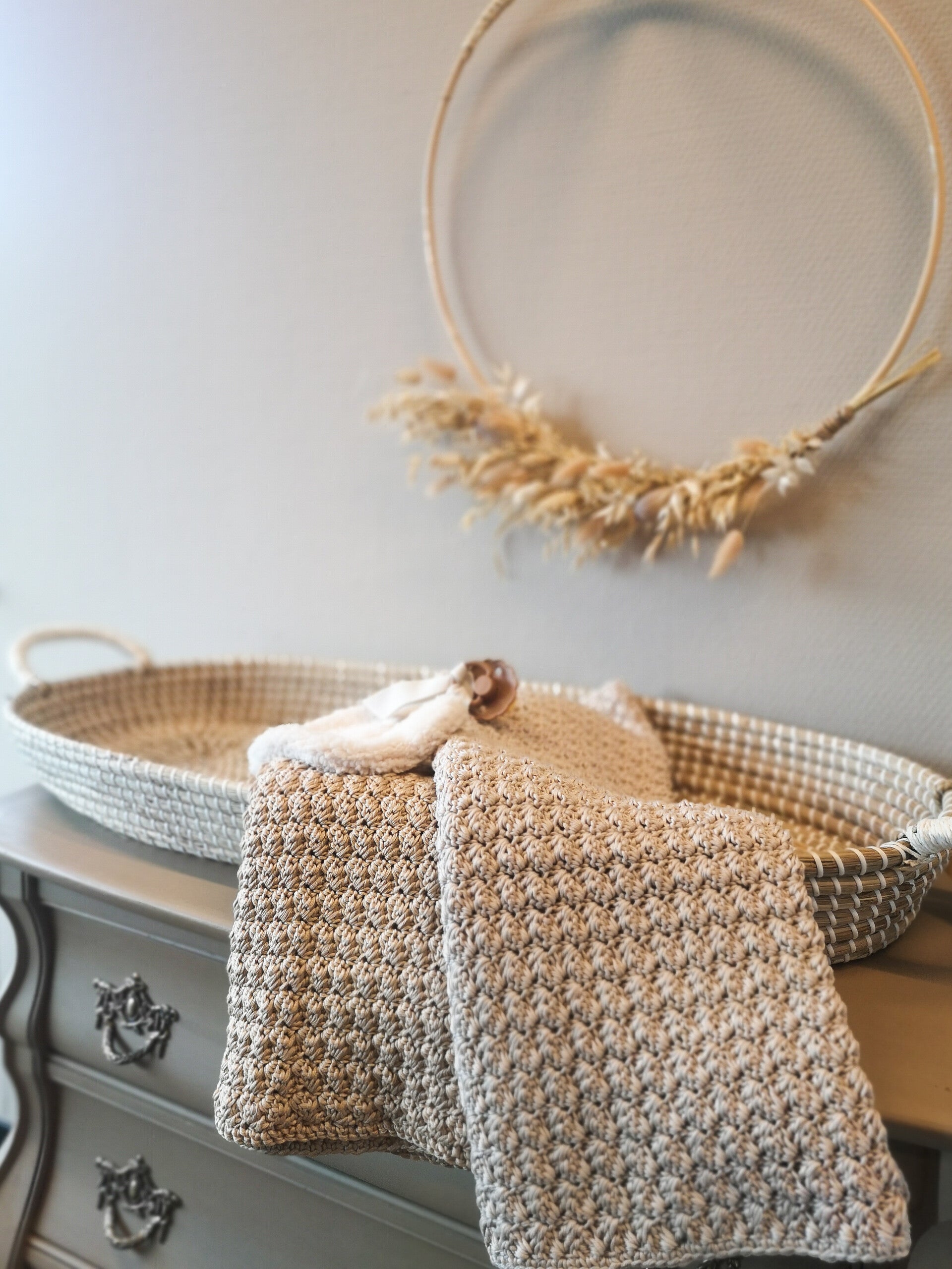 Katoenen gehaakte wiegdeken in licht- of donkerbeige.